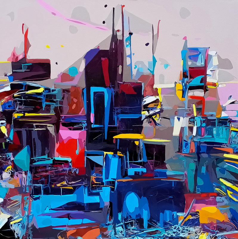 The chromatic palette is equally intense and vibrant, with the predominance of cool tones of blue and violet, but now, these colors take on a melancholic, almost frightening depth, suggesting a state of restraint and impossibility of movement. The usually vibrant accents of red, yellow and pink are transformed into a play of illusory lights, appearing and disappearing, like unattainable dreams. These colors intertwine with deep shadows, having the effect of amplifying the feeling of psychological imprisonment of someone trapped in a city that seems impossible to leave.