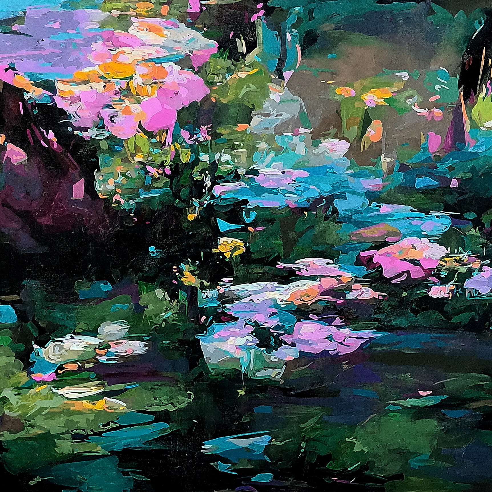 Într-un univers de tonuri adânci de verde și accente luminoase de albastru, florile roz își deschid petalele ca niște faruri delicate ce ghidează sufletul într-o călătorie spre lumină. Accentele de galben dansează printre frunze, asemenea razelor de soare ce străpung perdeaua timpului, creând o atmosferă vibrantă și plină de emoție. Fundalul, pictat cu nuanțe profunde, evocă misterul drumului parcurs, un traseu necunoscut, dar presărat cu promisiuni de frumusețe și descoperire.