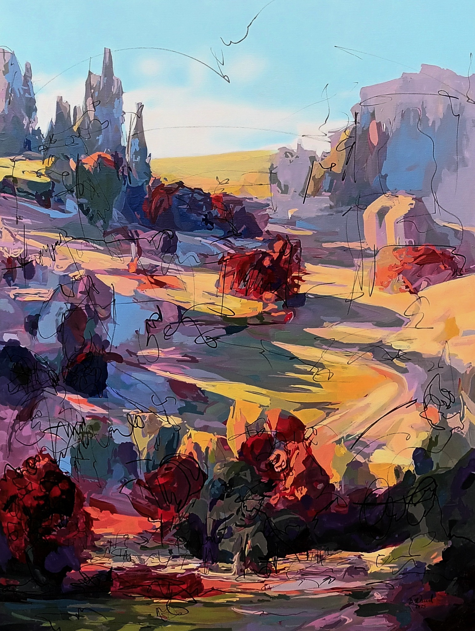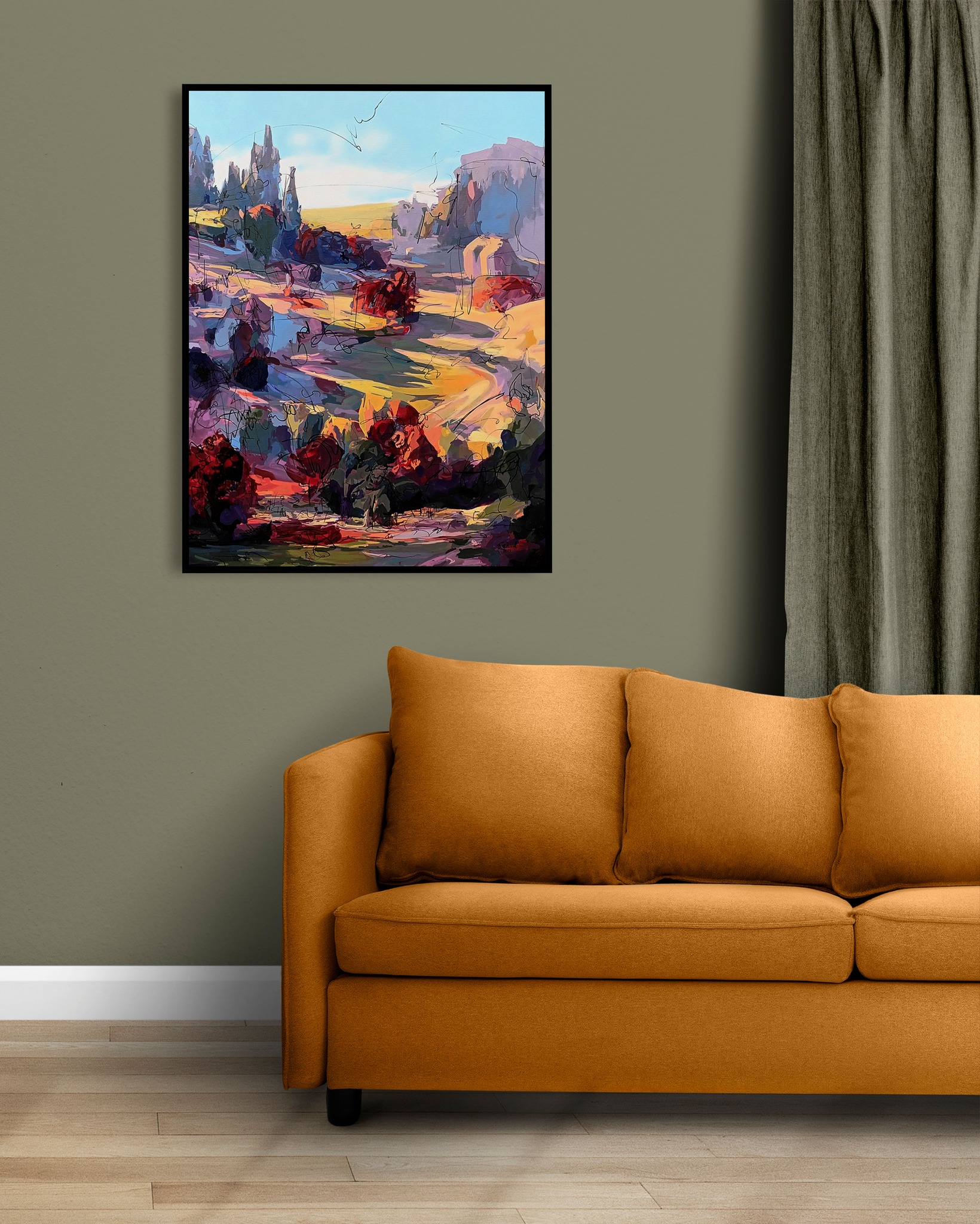 The rocks, scorched by forgotten winds, reveal their layers of ochre, burnt sienna and dusty grey, in a silent dance of earth tones, preserving the warmth of days gone by. On the rocky hills, the light slides in strips of violet, intertwining with copper reflections and indigo tints.