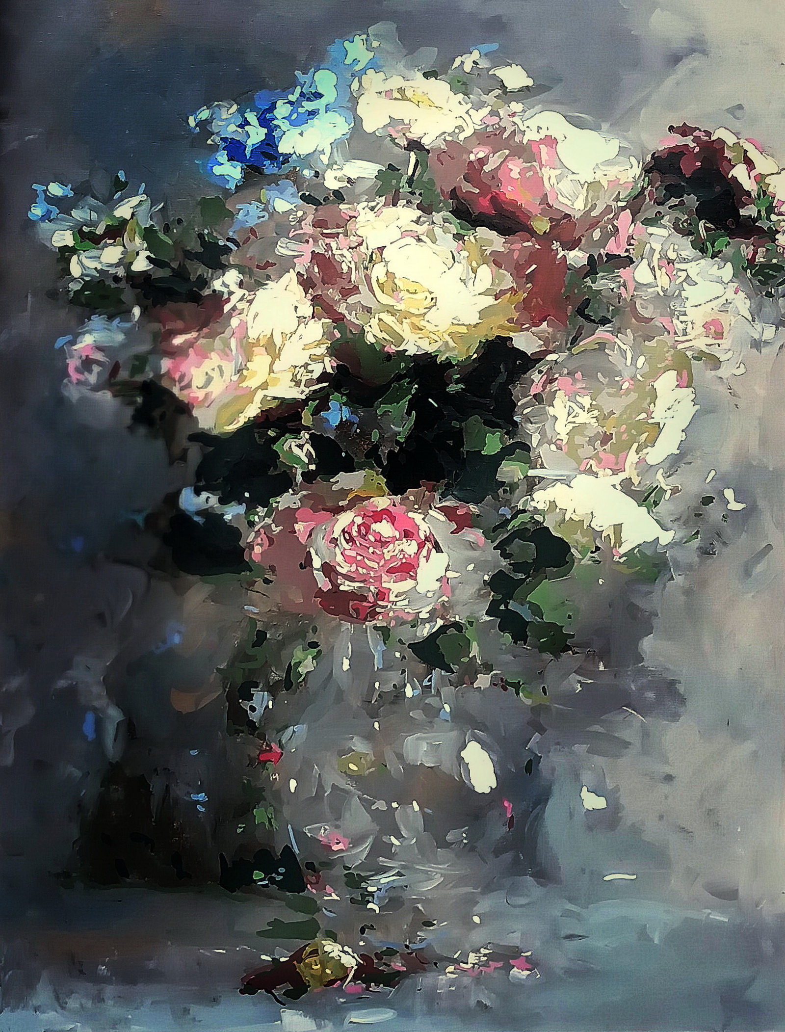 Jocul de lumini și umbre creează o atmosferă misterioasă, unde contururile devin vagi, aproape eterice. Reflexiile din vasul de sticlă sugerează o realitate fragmentată, ca și cum florile ar fi ecouri ale unor povești uitate, păstrate doar în paginile cărților vechi. Pensulațiile libere și fluide amplifică senzația de efemeritate, de parcă florile ar fi gata să se destrame în aer, ca un vis pe cale să se risipească.