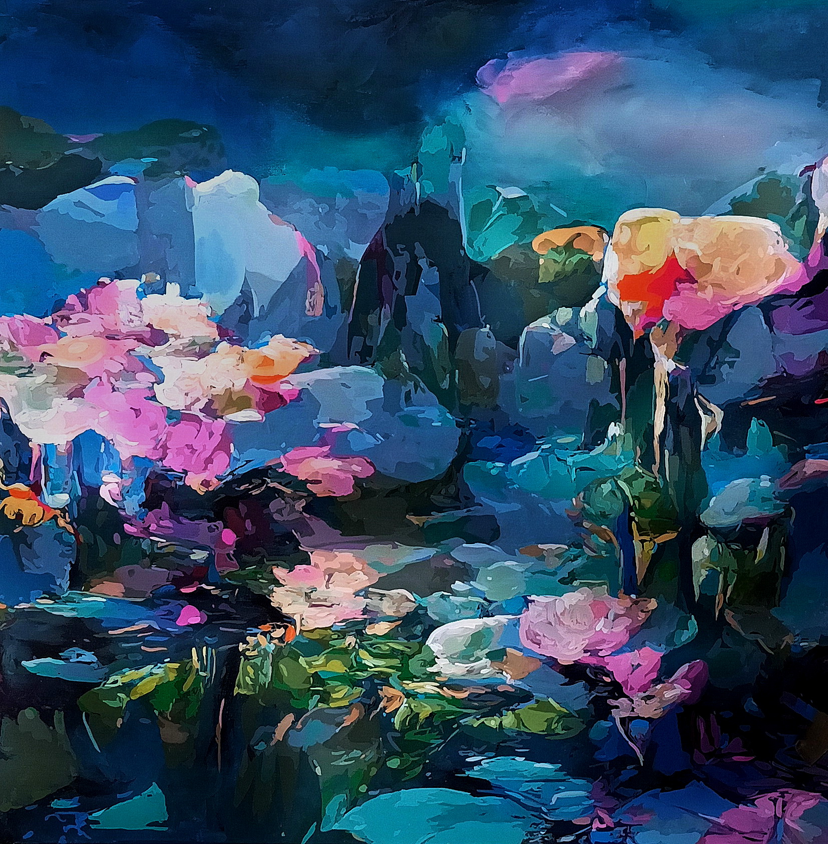 Pe un fundal seren, dominat de tonuri profunde de albastru și verde, florile își etalează frumusețea într-un dans cromatic plin de armonie. Nuanțele de roz, delicate și vibrante, par să răsară din adâncul peisajului, aducând un contrast fermecător cu atmosfera rece și liniștită a fundalului. Accentele de galben strălucesc subtil, asemenea unor raze de lumină filtrate printre petale, dând compoziției o energie caldă și vie.