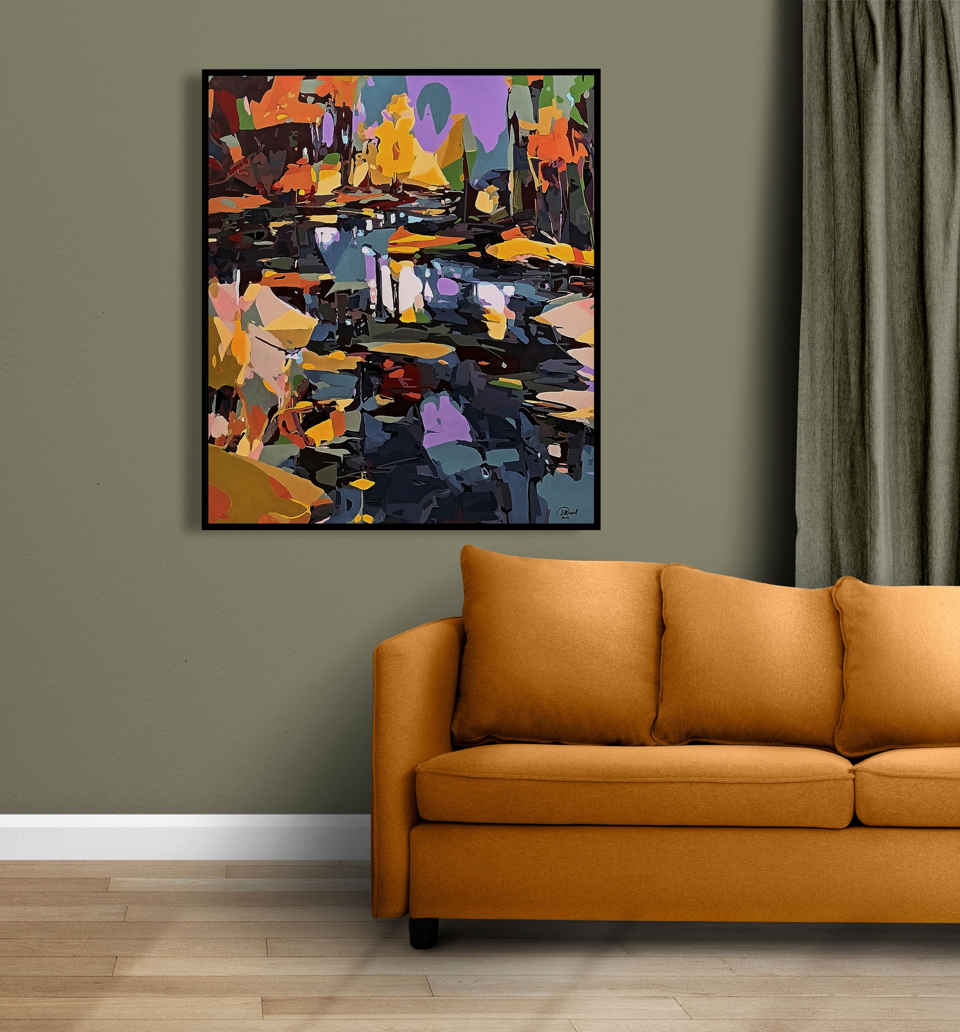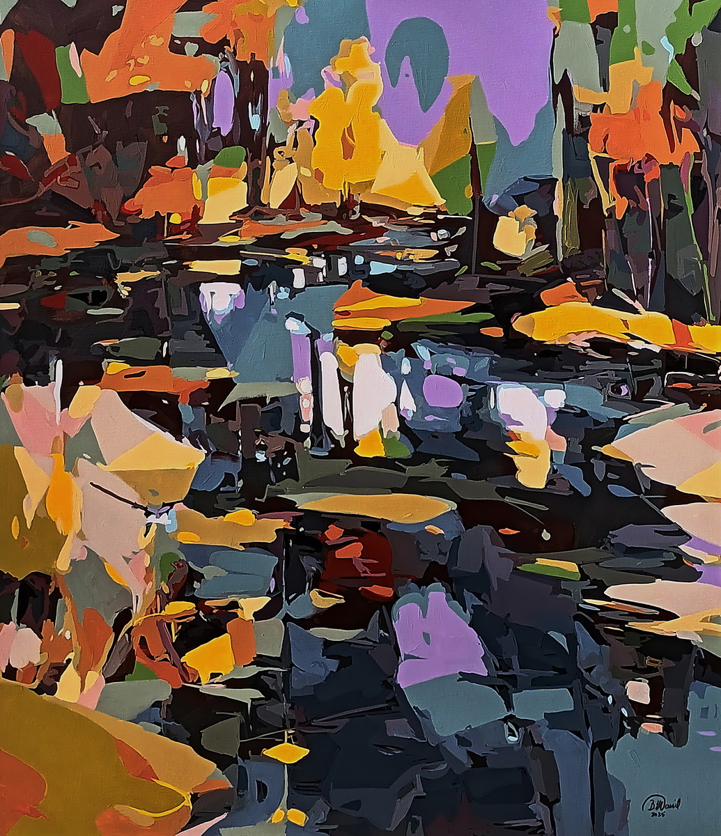 The work is a celebration of an imaginary lake, a space of self-discovery and inner connection, where the waters reflect a constantly evolving self. The harmonious colors, tones of green and purple grays, create a calming and contemplative atmosphere, and are juxtaposed with vibrant accents of yellow and orange, which bring a sense of optimism and vitality. Each wave of the water seems to carry within itself a story of rediscovery and liberation, and the contrast between soothing and energizing shades forms a visual symphony, in which hidden emotions come to the surface, in an explosion of light and color.