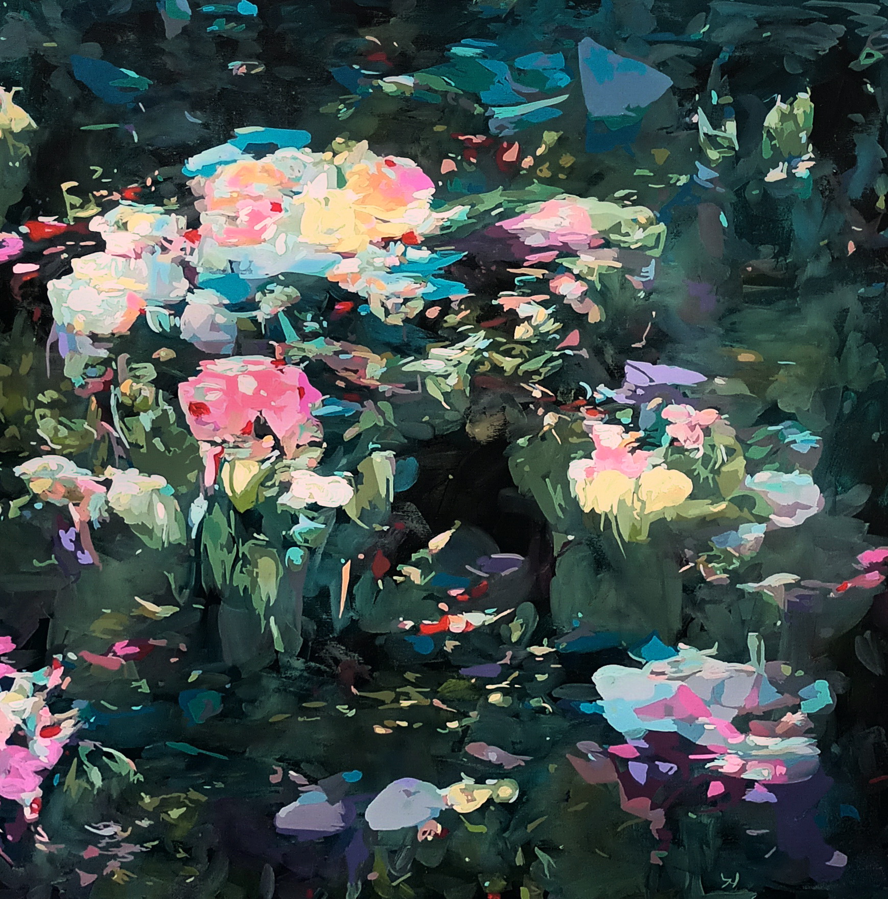 Tușele de pensulă, energice și pline de libertate, transmit senzația de mișcare, ca și cum florile ar fi surprinse în adierea unui vânt ușor. Frunzele și tulpinile par să îmbrățișeze fiecare floare, creând un echilibru natural între delicatețe și forță. Lumina filtrată prin petale adaugă un joc subtil de umbre și străluciri, făcând ca întreaga scenă să pulseze cu o energie caldă și reconfortantă.