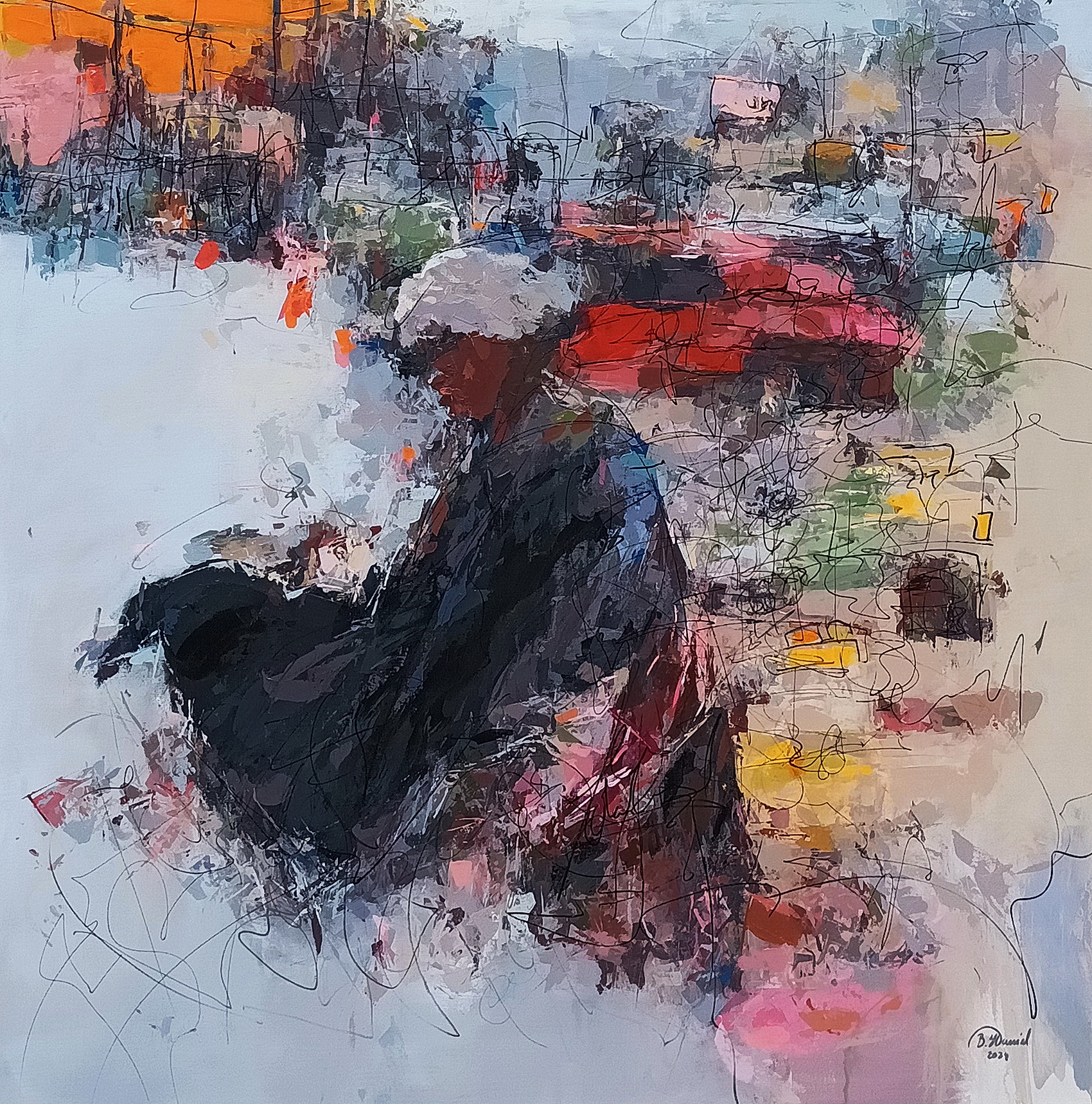 Un personaj solitar, resemnat, se pierde în tumultul orașului, conturat printr-o compoziție abstractă, unde liniile și formele par să se dizolve în ritmul alert al vieții urbane. Zonele de gri predomină, ca un voal dens care învăluie scena, sugerând anonimatul și singurătatea. Cu toate acestea, din acest fundal neutru, răbufnesc culori saturate – accente vibrante de roșu, galben și albastru, ce par să spargă monotonia, asemenea emoțiilor reprimate care ies brusc la suprafață.