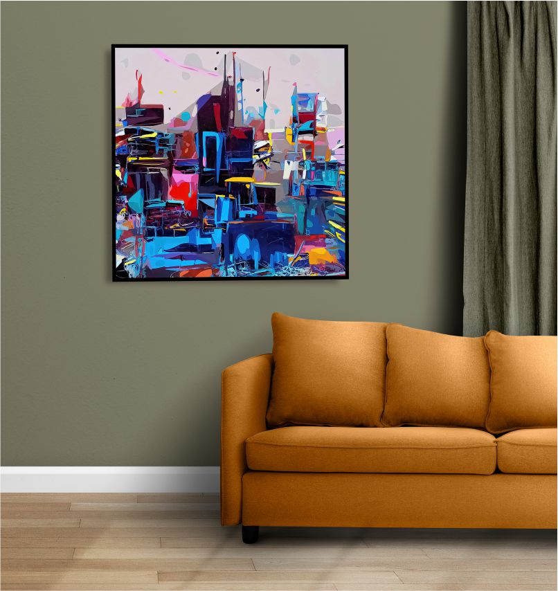 The chromatic palette is equally intense and vibrant, with the predominance of cool tones of blue and violet, but now, these colors take on a melancholic, almost frightening depth, suggesting a state of restraint and impossibility of movement. The usually vibrant accents of red, yellow and pink are transformed into a play of illusory lights, appearing and disappearing, like unattainable dreams. These colors intertwine with deep shadows, having the effect of amplifying the feeling of psychological imprisonment of someone trapped in a city that seems impossible to leave.