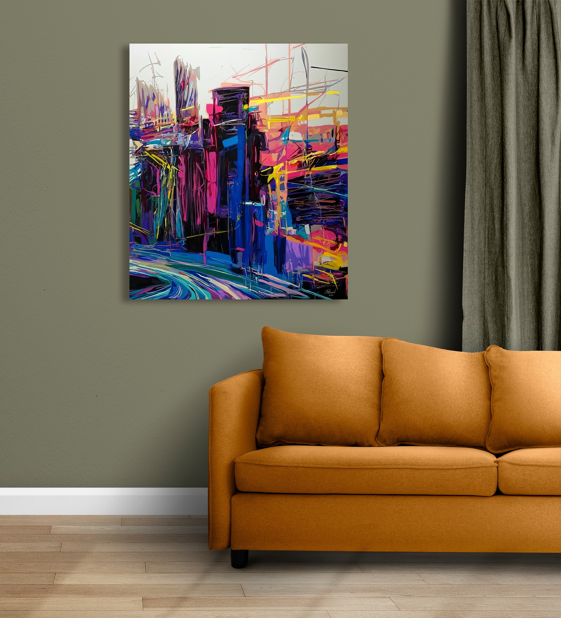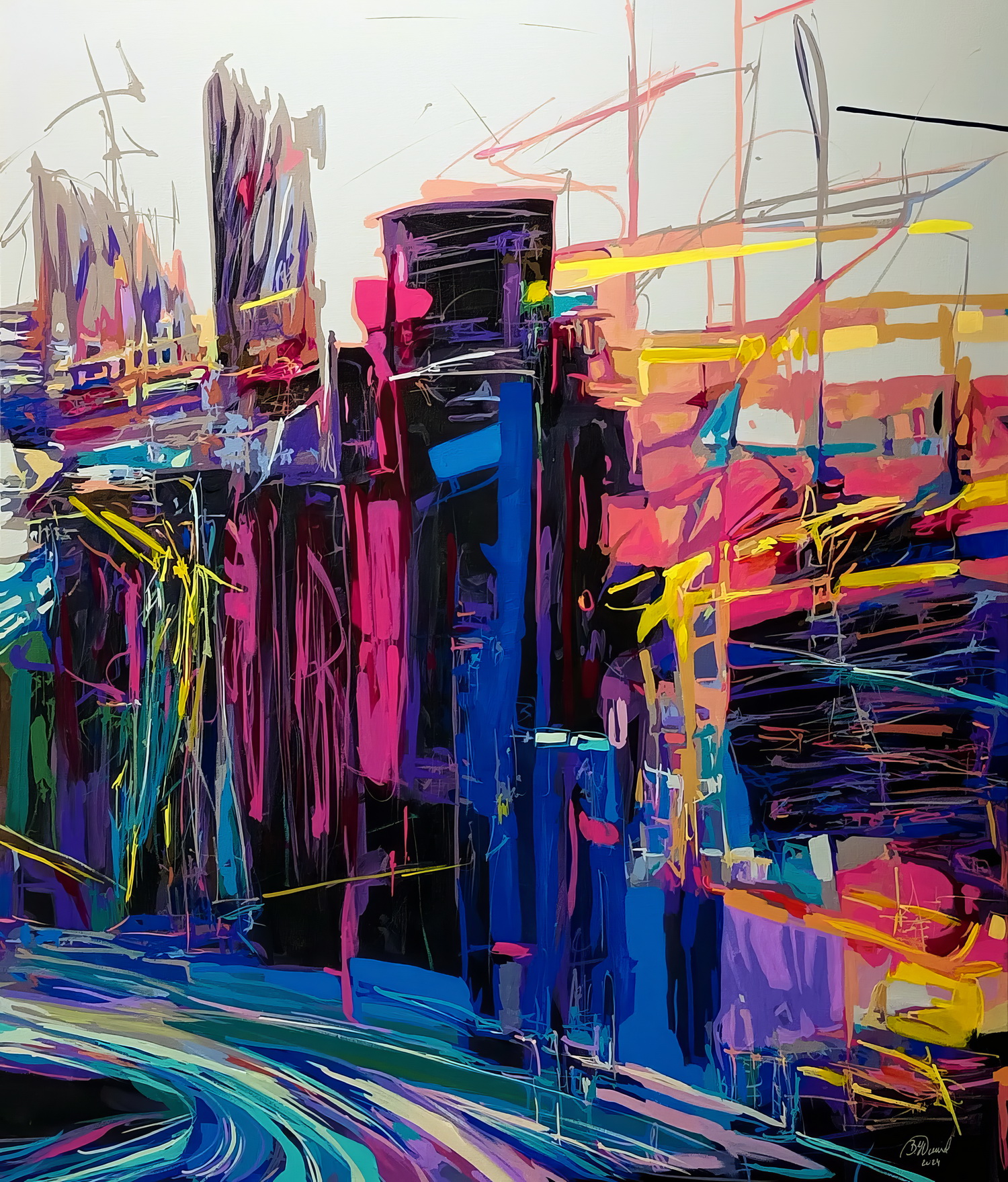 The Time that Runs is an explosion of movement and ephemerality, an urban landscape where days melt into a whirlwind of colors and shapes. The background pulsates in muted tones of bluish grays and fragile shadows, outlining buildings and streets that seem suspended between reality and illusion. In this almost static setting, human paths intertwine like lines of ephemeral light, overlapping, intersecting, rushing without stopping.